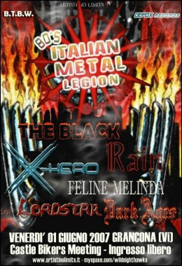80's Italian Metal Legion festival 2007 01 June in Grancona ,Italy.Great cult band like THE BLACK,RAIN,X-HERO,FELINE MELINDA,LOADSTAR,DARK AGES...Free enter!!